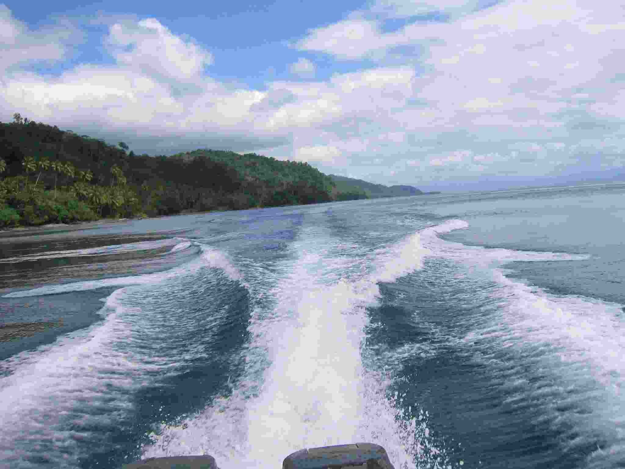 Boat day trips from Wagawaga bay. The lodge boat with our experienced crew will take you along the southern arm of Milne bay. Steep forest covered slopes rise almost from the waters edge to the tops of the line of ranges that form the eastern most tip of the Owen Stanley mountain range. Villages dot the foreshore. Food garden clearings rise steeply behind the villages while the flat land close to the shore is planted with coconuts. Forty minutes by boat from Wagawaga the line of hills is broken by the outflow of the Dawadawa river into Milne Bay.
